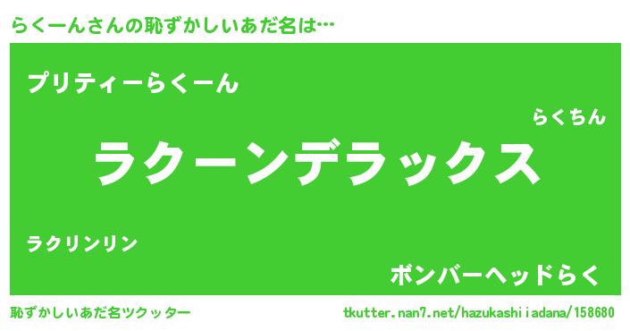 | 男性向けラノベタイトル風あだ名 | 『Re:らくーんから始める異世界生活』 |