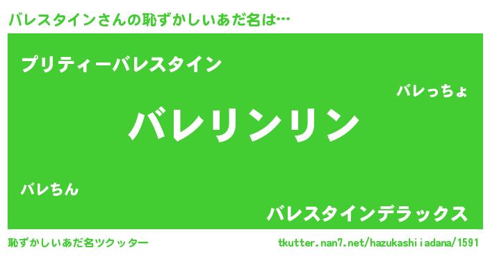 | 男性向けラノベタイトル風あだ名 | 『バレスタインの嫁は女の子じゃないと思った?』 |