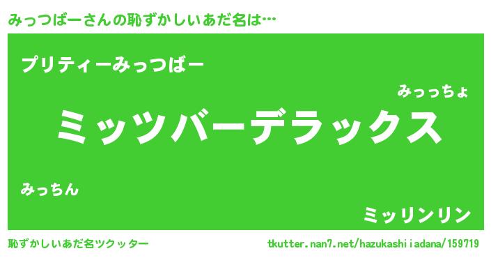 | 男性向けラノベタイトル風あだ名 | 『Re:みっつばーから始める異世界生活』 |