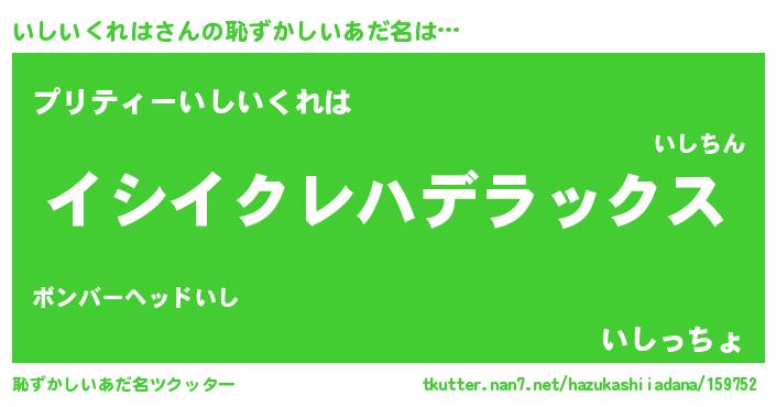 | ヒーロー風カッコイイあだ名 | 『究極戦士イシイクレハ』『仮面イシダー』 |