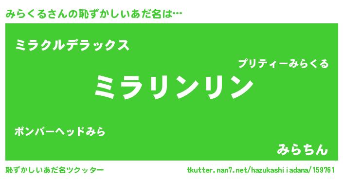 | ヘコむあだ名 | 『みら太郎』『みらくる(震え声)』 |