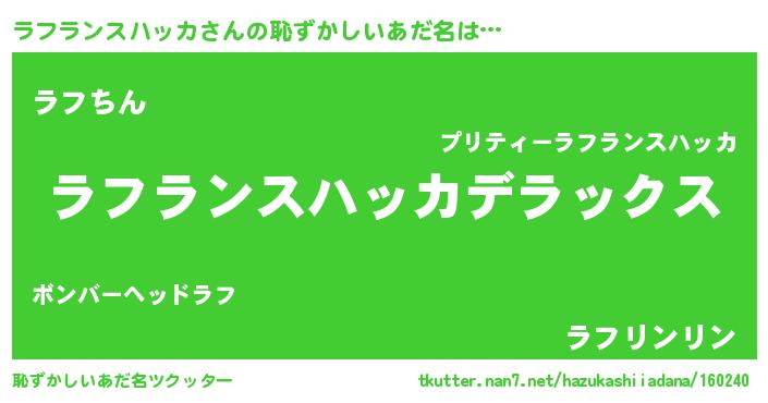 ラフランスハッカさんの恥ずかしいあだ名は… 『ラフランスハッカデラックス』『ラフちん』『ラフリンリン』 ツクッター #恥ずかしいあだ名ツクッター http://tkutter.nan7.net/hazukashiiadana/160240/