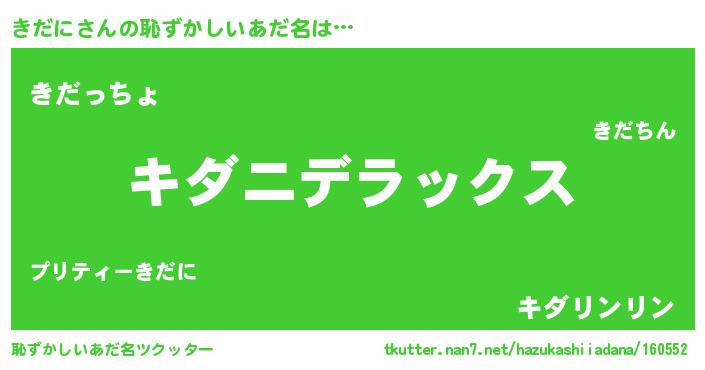 | 男性向けラノベタイトル風あだ名 | 『Re:きだにから始める異世界生活』 |