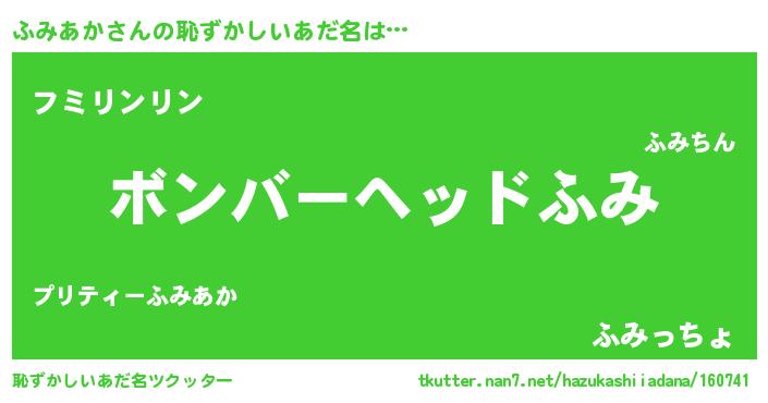 ふみあかさんの恥ずかしいあだ名は… 『ボンバーヘッドふみ』『フミリンリン』『ふみっちょ』 ツクッター #恥ずかしいあだ名ツクッター http://tkutter.nan7.net/hazukashiiadana/160741/