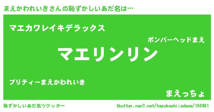 | 男性向けラノベタイトル風あだ名 | 『まえかわれいき~年齢イコール彼女いない歴の魔法使い~』 |