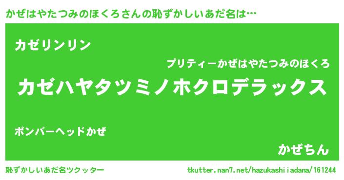 | 男性向けラノベタイトル風あだ名 | 『カゼハヤタツミノホクロスレイヤー』 |