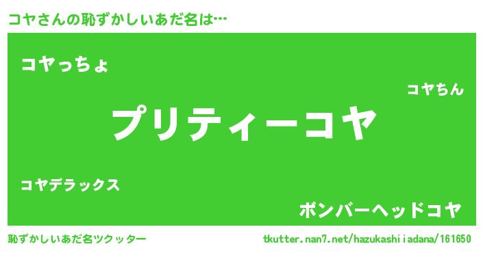 コヤさんの恥ずかしいあだ名は… 『プリティーコヤ』『コヤっちょ』『ボンバーヘッドコヤ』 ツクッター #恥ずかしいあだ名ツクッター http://tkutter.nan7.net/hazukashiiadana/161650/
