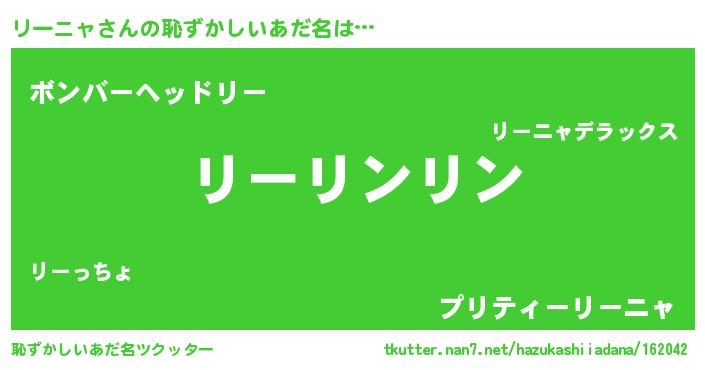 | 男性向けラノベタイトル風あだ名 | 『リーニャの嫁は女の子じゃないと思った?』 |