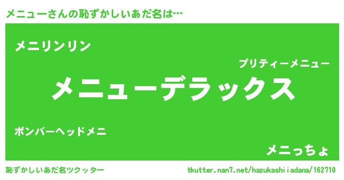 | ヒーロー風カッコイイあだ名 | 『サイバー戦士メニュー』『魔戒騎士メニ』 |