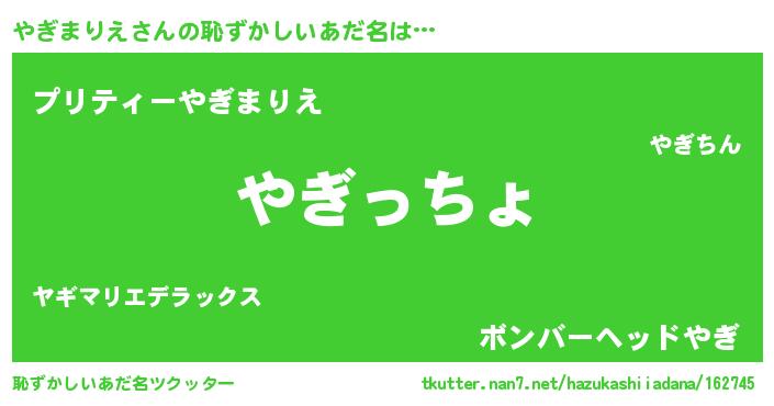 | 男性向けラノベタイトル風あだ名 | 『やぎまりえ~年齢イコール彼女いない歴の魔法使い~』 |