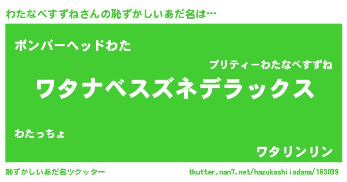 | 男性向けラノベタイトル風あだ名 | 『わたなべすずね~年齢イコール彼女いない歴の魔法使い~』 |