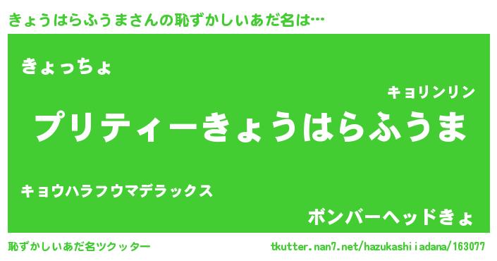 | 欧米人風あだ名 | 『アンジェラ・きょうはらふうま』 |