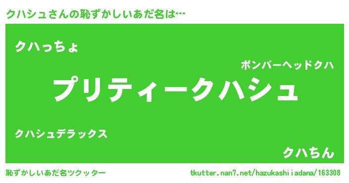| 男性向けラノベタイトル風あだ名 | 『クハシュの憂鬱』『クハシュスレイヤー』 |