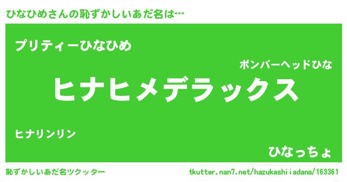 | ヒーロー風カッコイイあだ名 | 『ウルトラ戦士ヒナヒメ』『仮面ヒナダー』 |
