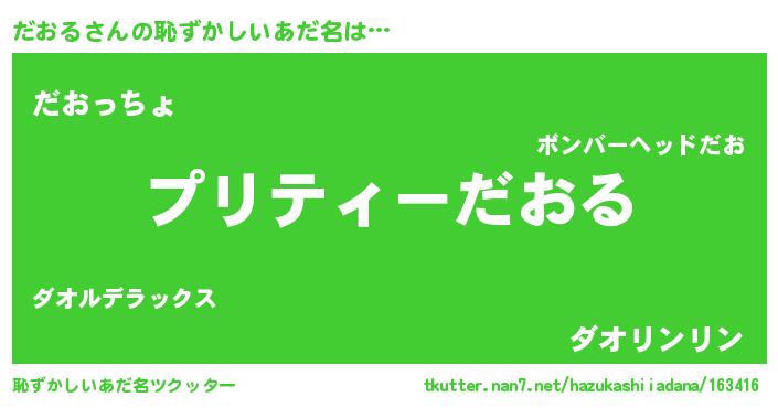 だおるさんの恥ずかしいあだ名は… 『プリティーだおる』『だおっちょ』『ダオリンリン』 ツクッター #恥ずかしいあだ名ツクッター http://tkutter.nan7.net/hazukashiiadana/163416/