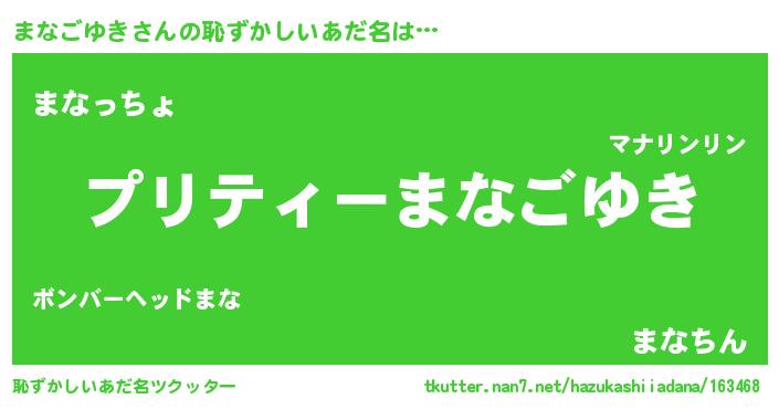 | 胡散臭い通販商品みたいなあだ名 | 『必ず成功するブレスレット…その名も「まなごゆき」』 |