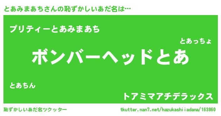 | 男性向けラノベタイトル風あだ名 | 『おまえをオタクにしてやるから、俺をとあみまあちにしてくれ! 』 |