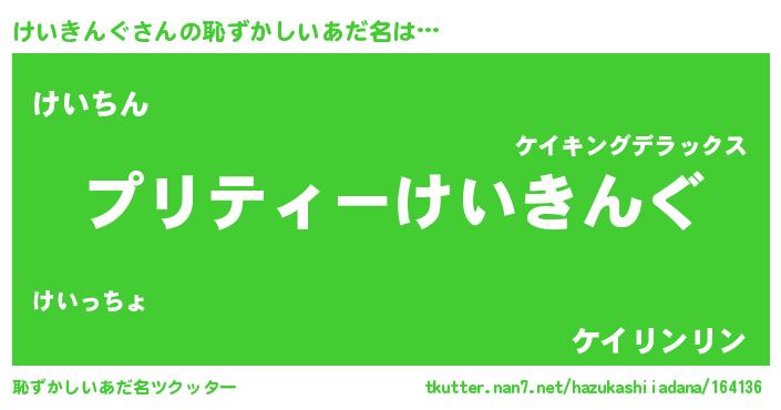 けいきんぐさんの恥ずかしいあだ名は… 『プリティーけいきんぐ』『けいちん』『ケイリンリン』 ツクッター #恥ずかしいあだ名ツクッター http://tkutter.nan7.net/hazukashiiadana/164136/