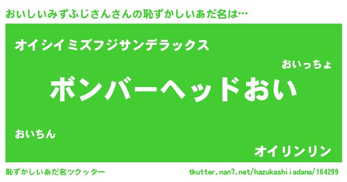 | 男性向けラノベタイトル風あだ名 | 『おまえをオタクにしてやるから、俺をおいしいみずふじさんにしてくれ! 』 |