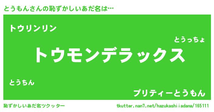 | 意味不明あだ名 | 『自称とうもん』『ペロリンとうもん』 |