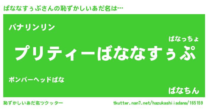 | 男性向けラノベタイトル風あだ名 | 『ばななすぅぷに滅ぼされるだけの簡単なお仕事です』 |