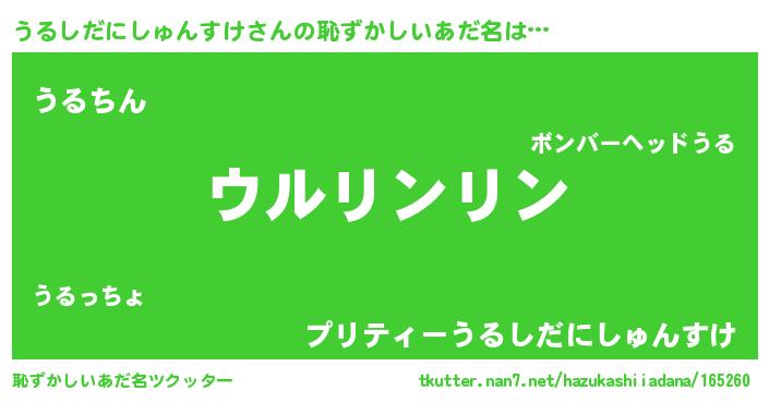| 男性向けラノベタイトル風あだ名 | 『うるしだにしゅんすけの嫁は女の子じゃないと思った?』 |