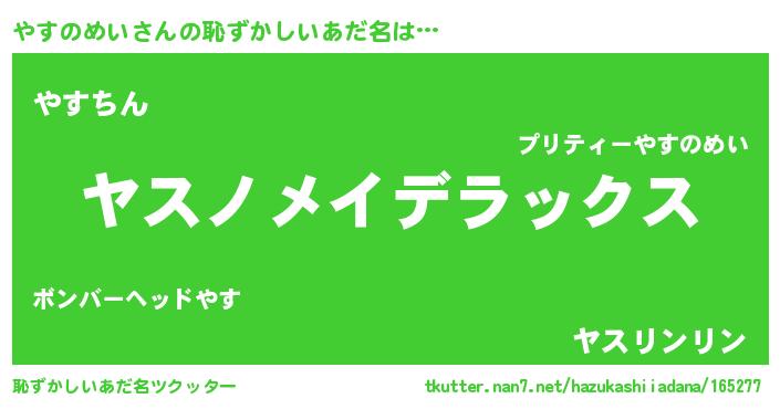 | 意味不明あだ名 | 『自称やすのめい』『永久保存やすのめい』 |