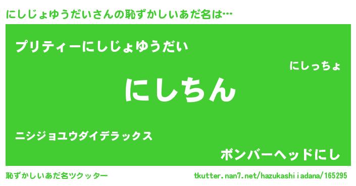 | ヘコむあだ名 | 『にしじょゆうだい(笑)』『にしもー』 |
