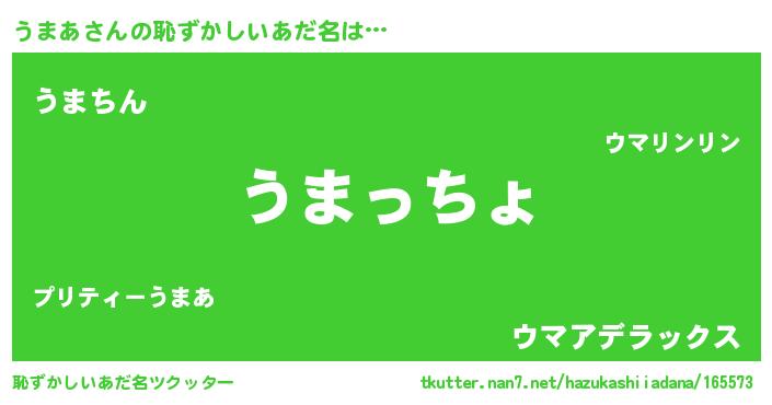 | 男性向けラノベタイトル風あだ名 | 『うまあ~年齢イコール彼女いない歴の魔法使い~』 |