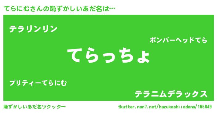 | 男性向けラノベタイトル風あだ名 | 『てらにむ~年齢イコール彼女いない歴の魔法使い~』 |