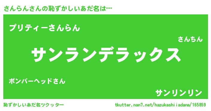 | 男性向けラノベタイトル風あだ名 | 『Re:さんらんから始める異世界生活』 |