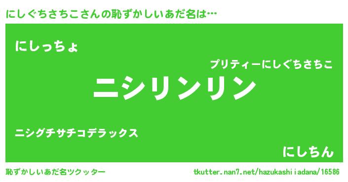 | 意味不明あだ名 | 『住所不定無職にしぐちさちこ(10歳)』 |