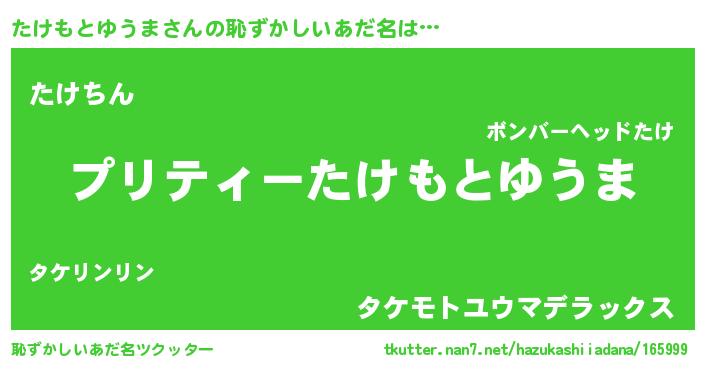 | ヘコむあだ名 | 『たけにー』『たけもとゆうま(笑)』 |
