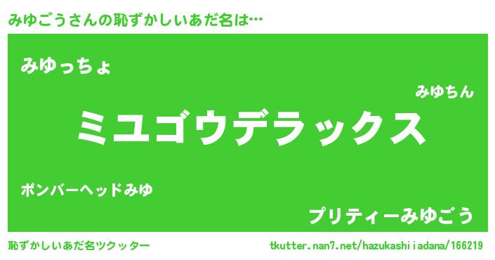 | ヒーロー風カッコイイあだ名 | 『仮面ミユダー』『最強戦士ミユゴウ』 |