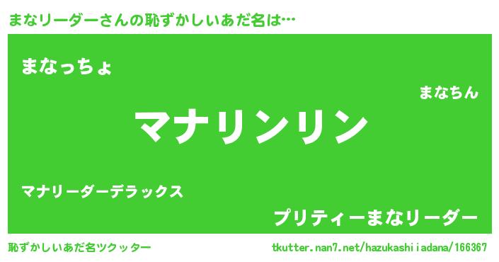 | 女子向けラノベタイトル風あだ名 | 『まなリーダーは平凡を望む』 |