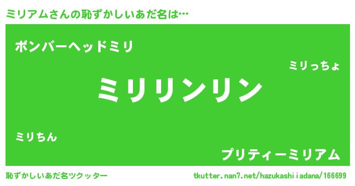 | 意味不明あだ名 | 『住所不定無職ミリアム(81歳)』 |