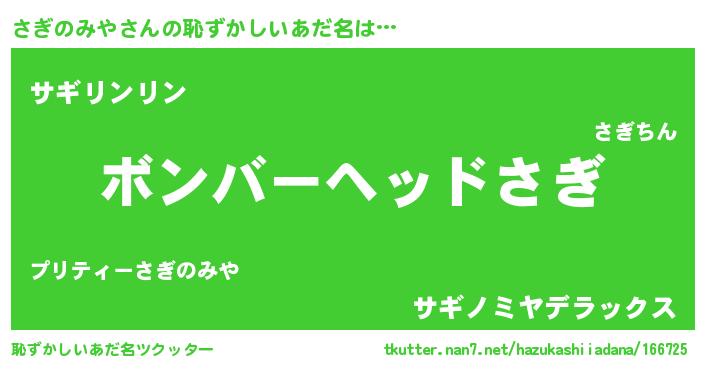 | ヒーロー風カッコイイあだ名 | 『天空の使者さぎのみや』『暗黒騎士サギ』 |
