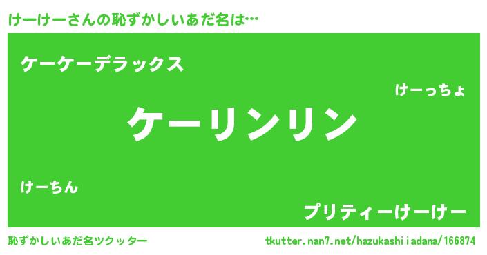 | 男性向けラノベタイトル風あだ名 | 『この素晴らしい世界にけーけーを!』 |