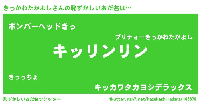 | 男性向けラノベタイトル風あだ名 | 『きっかわたかよしの嫁は女の子じゃないと思った?』 |
