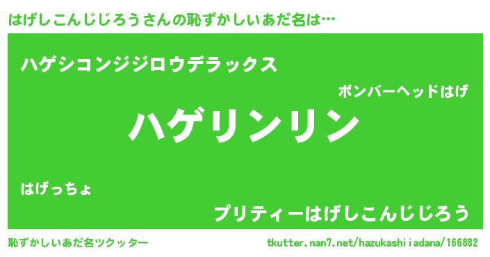 | 男性向けラノベタイトル風あだ名 | 『はげしこんじじろうの嫁は女の子じゃないと思った?』 |