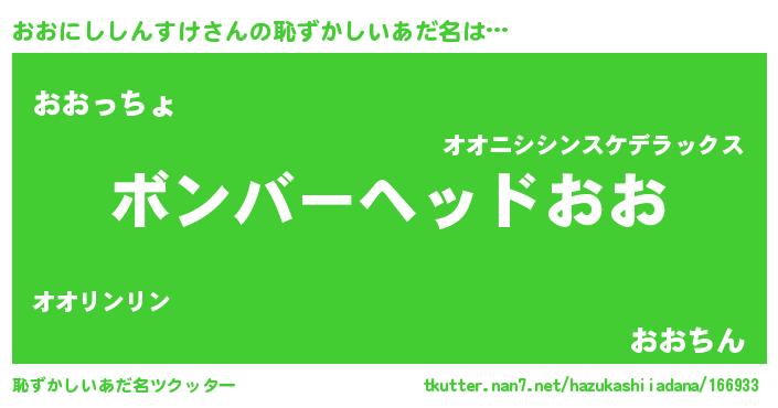 | 男性向けラノベタイトル風あだ名 | 『ノーゲーム・ノーオオニシシンスケ』 |
