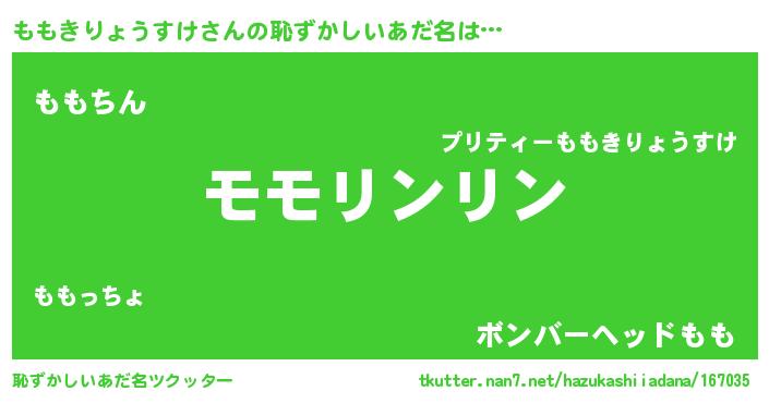 | 男性向けラノベタイトル風あだ名 | 『ももきりょうすけの嫁は女の子じゃないと思った?』 |