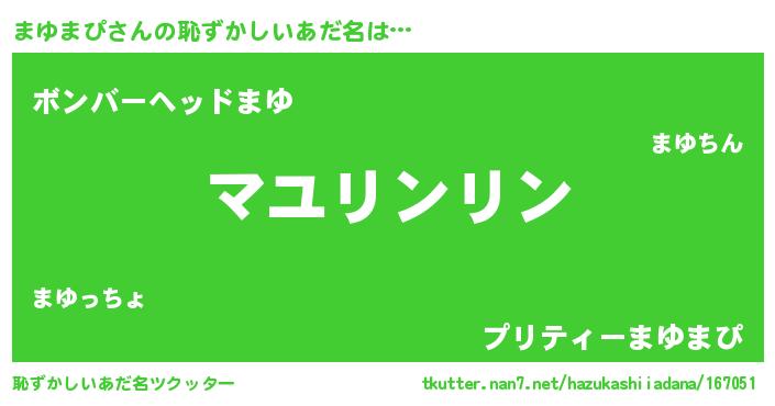 | ヘコむあだ名 | 『まゆっぺ』『まゆっふぃ~』 |