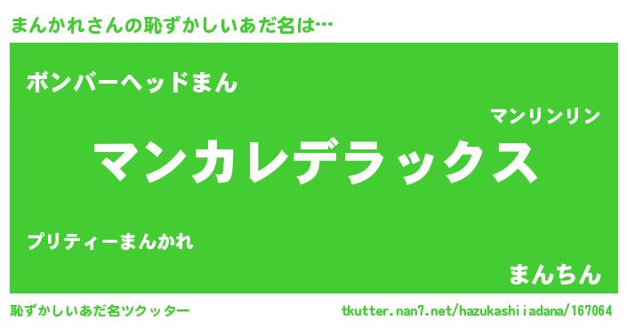 | 意味不明あだ名 | 『自称まんかれ』『永久保存まんかれ』 |
