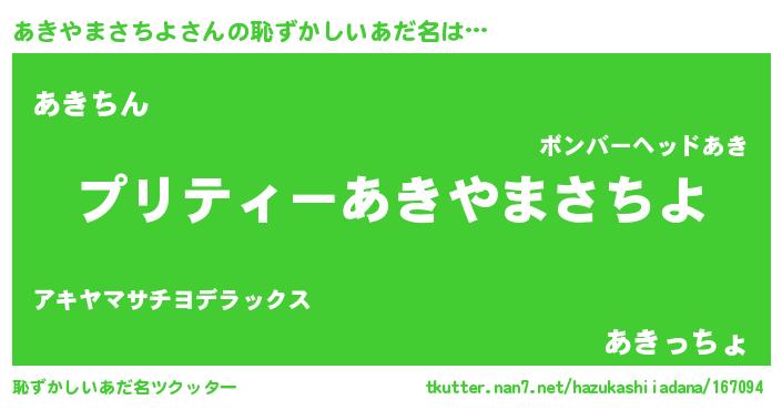 | ヘコむあだ名 | 『あきにゅー』『あきやまさちよ(小並感)』 |