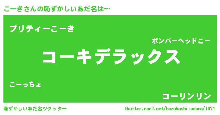| 意味不明あだ名 | 『自称こーき』『なめこ科こーき属』 |
