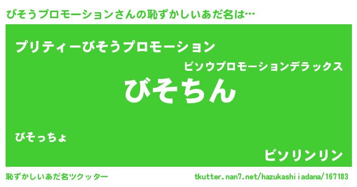 | ヘコむあだ名 | 『びそうプロモーション(笑)』『びそにゅー』 |