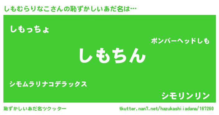| ヘコむあだ名 | 『しもむらりなこ(小並感)』『なまこ酢』 |
