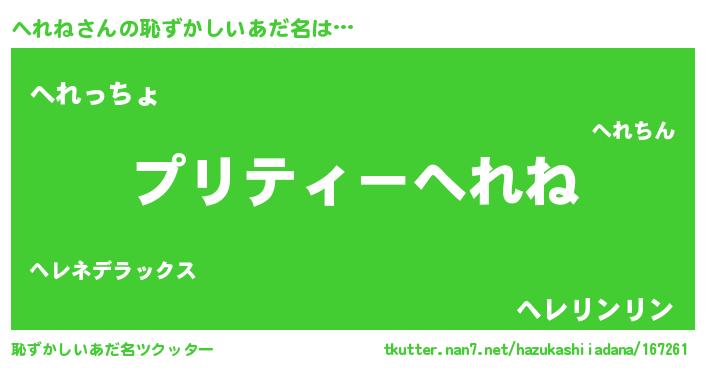 | 男性向けラノベタイトル風あだ名 | 『転生したらへれねだった件』 |