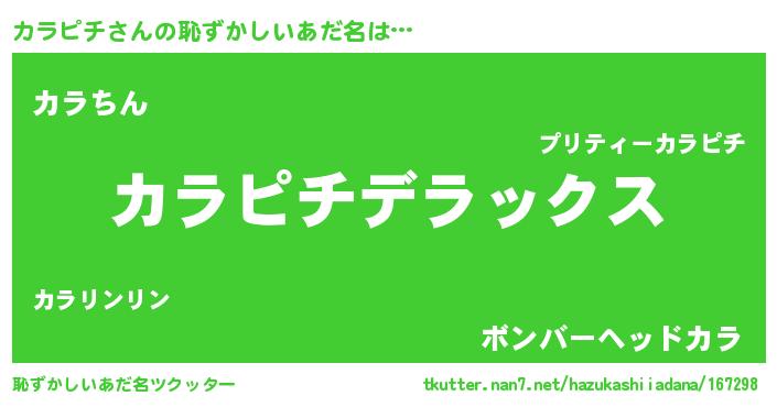 | 意味不明あだ名 | 『自称カラピチ』『永久保存カラピチ』 |